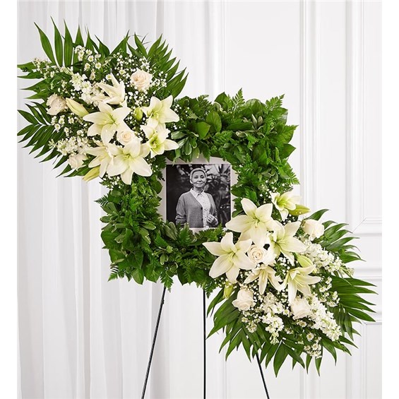 Celebrate the cherished memories you shared with a beautiful floral arrangement. Our unique design features a square wreath of greenery—perfect for displaying a photo—and two sprays on each end gathered with soothing white blooms for a lush, full presentation. It’s a special tribute to honor the life of a loved one. Standing spray arrangement features a stylized 18" square wreath with assorted greenery covering the base and two floral sprays at opposite ends gathered with white roses and Asiatic lilies, stock and monte casino; accented with baby’s breath and soft, lush greenery Measures approximately 38"H x 40"W without stand Arrives on an easel; measures 66"H Appropriate for the funeral home or gravesite Our florists hand-design each arrangement, so colors and varieties may vary due to local availability To ensure lasting beauty, Asiatic lilies may arrive in bud form and will fully bloom over the next few days